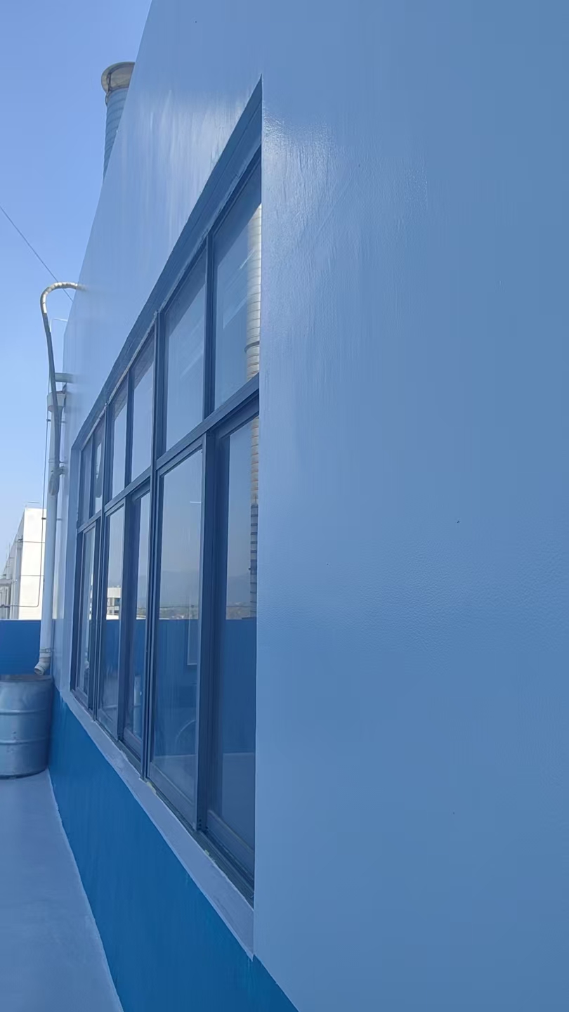 下图是采用创遂聚脲防水涂料1005(也可以用高压无气喷涂机喷涂),施工的建筑外墙